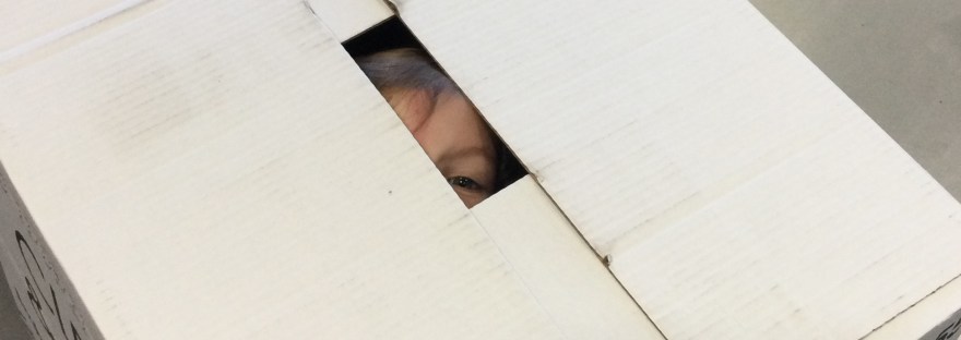 Photo: A child peers out from a small hole in between the flaps of a big box.
