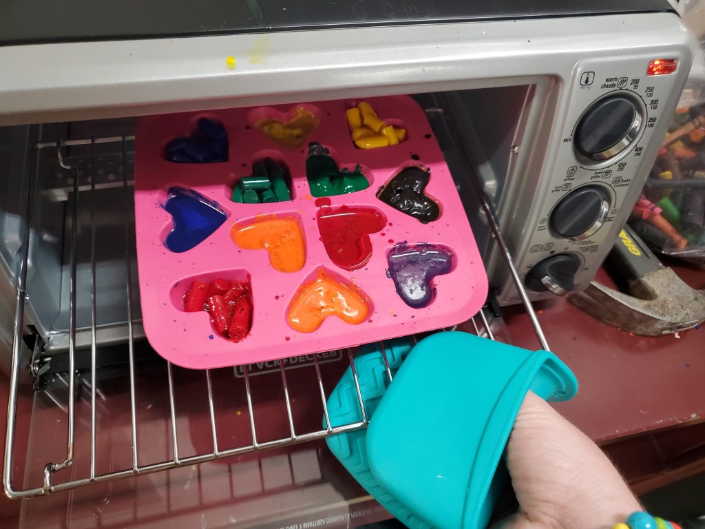 - Melted Crayon Molds: broken crayons; silicone molds; mallet; plastic bags; toaster oven or microwave